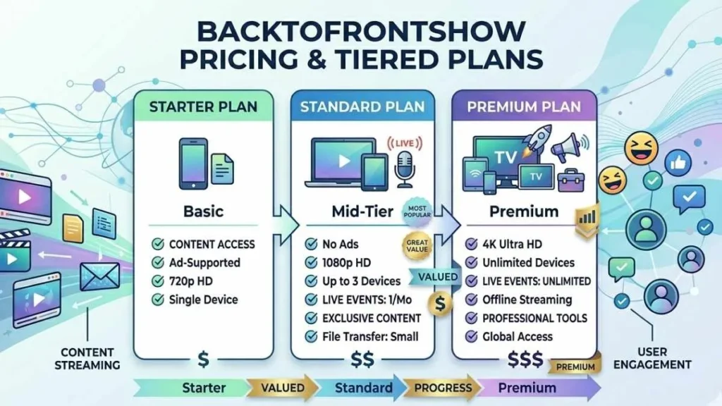 Most digital content platforms today, including BackToFrontShow, use tier-based pricing. These plans differ in cost depending on the features, tools, and exclusivity they provide. Entry-level plans may focus on basic content access, while higher-tier options unlock premium shows, advanced user tools, or priority support. This flexible structure ensures users can start affordably and scale their experience as their engagement grows.