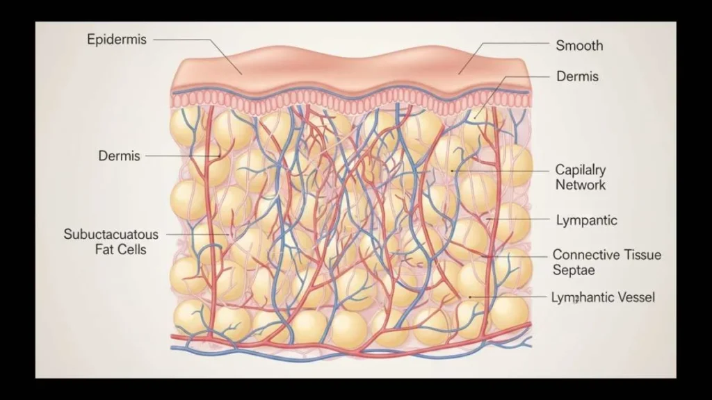 Subcutaneous fat interacts with fibrous septa. Proper connective tissue support prevents fat from creating surface irregularities, resulting in an even, toned skin appearance.