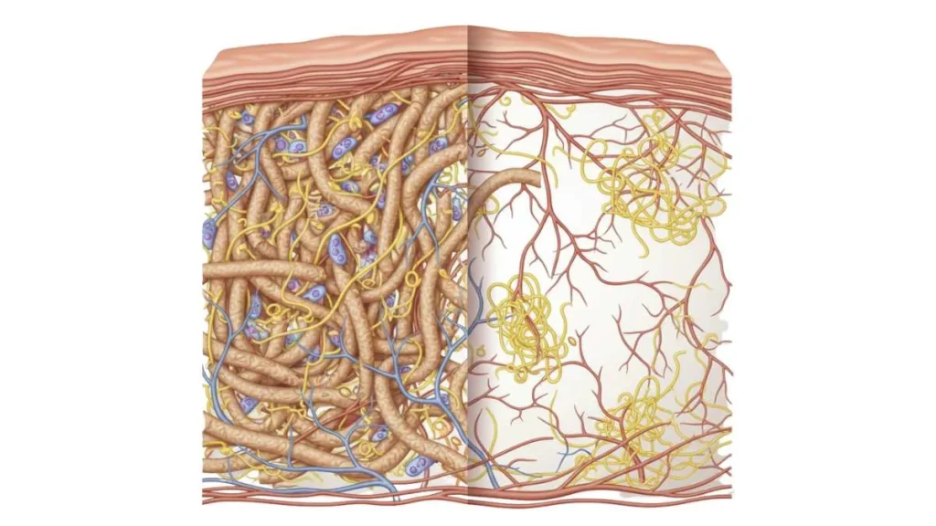 Collagen provides strength while elastin maintains elasticity. Strong, organized fibers ensure the skin remains firm and flexible, resisting sagging and dimpling.