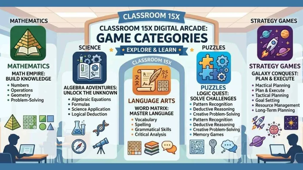 Classroom 15X provides a wide range of games that cater to various interests and learning styles. Each category offers unique opportunities for skill-building and academic reinforcement.