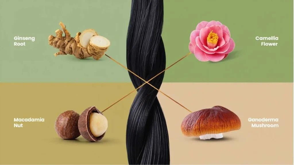 Ginseng | Stimulates blood flow to the scalp | Promotes hair growth and reduces hair fall |