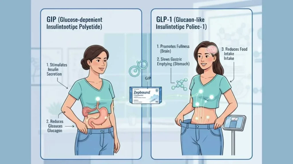 Zepbound is a dual GIP and GLP-1 receptor agonist, a breakthrough in obesity treatment. By activating both incretin hormones, it effectively reduces appetite, increases feelings of fullness after meals, slows gastric emptying, and improves blood sugar regulation in overweight adults.